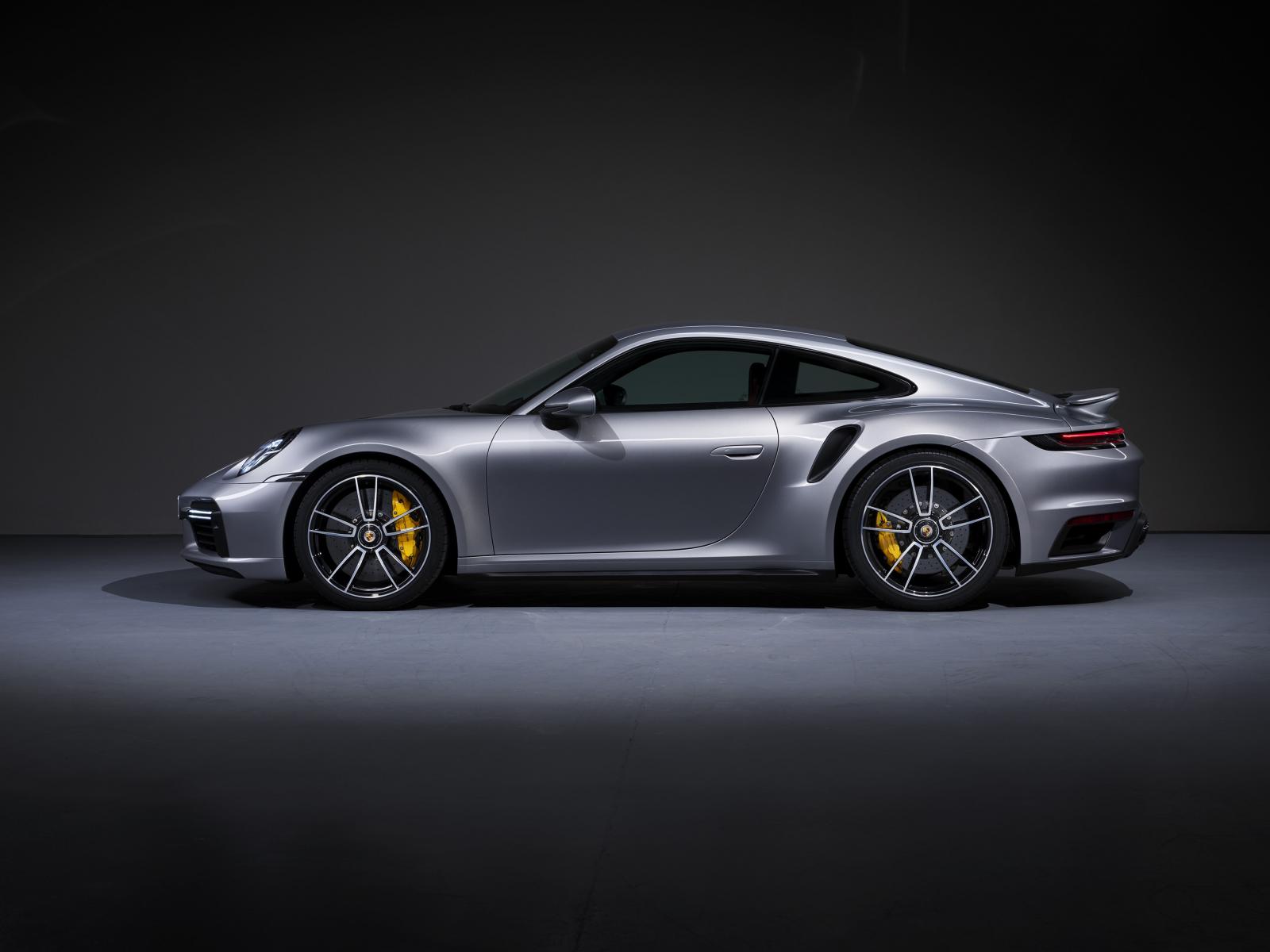 Обои Серебристый автомобиль Porsche 911 Turbo S 2020 года вид сбоку