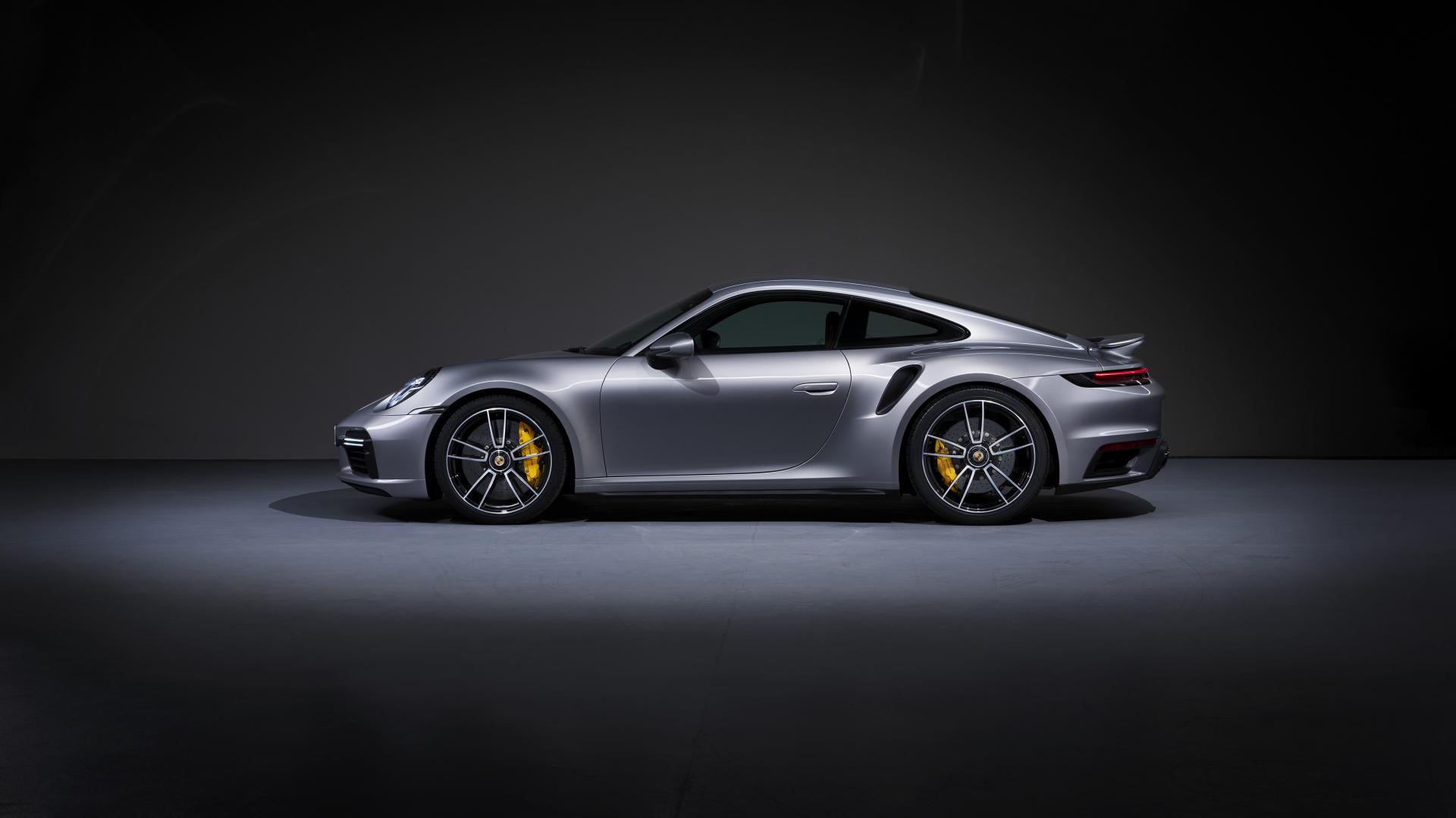 Обои Серебристый автомобиль Porsche 911 Turbo S 2020 года вид сбоку