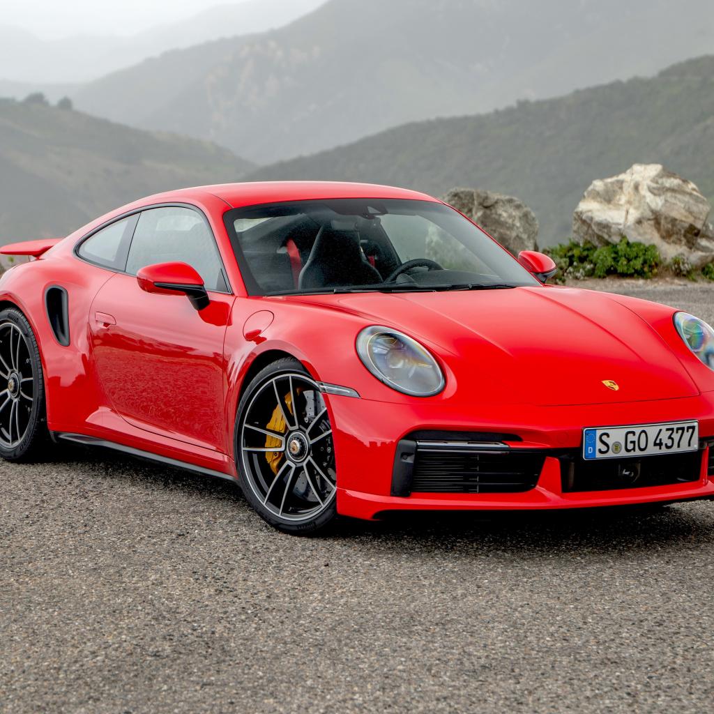 Обои Красный автомобиль Porsche 911 Turbo S 2020 года на фоне гор