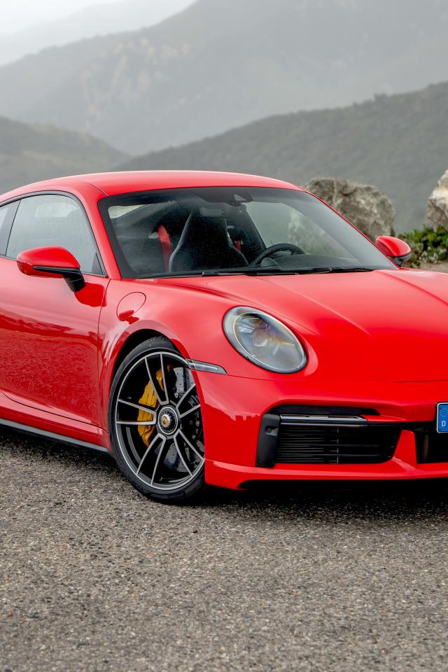 Обои Красный автомобиль Porsche 911 Turbo S 2020 года на фоне гор
