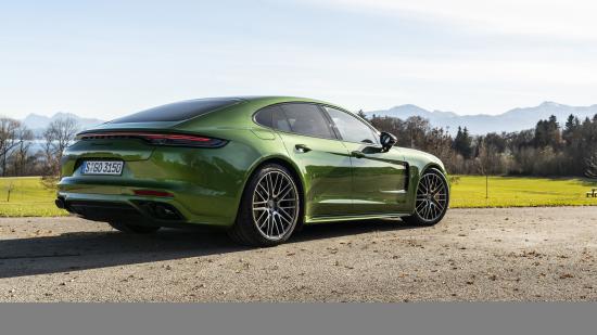 Обои Зеленый автомобиль Porsche Panamera 4S 2021 года вид сзади