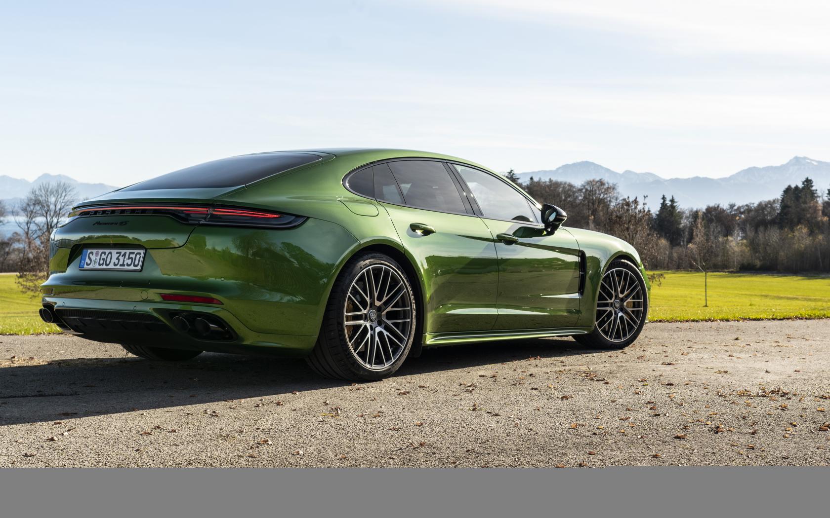 Обои Зеленый автомобиль Porsche Panamera 4S 2021 года вид сзади