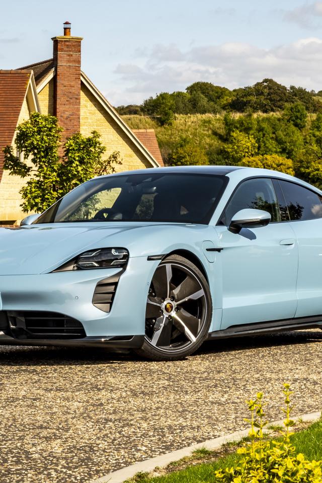 Обои Голубой автомобиль Porsche Taycan 4S 2021 года у дома вид спереди
