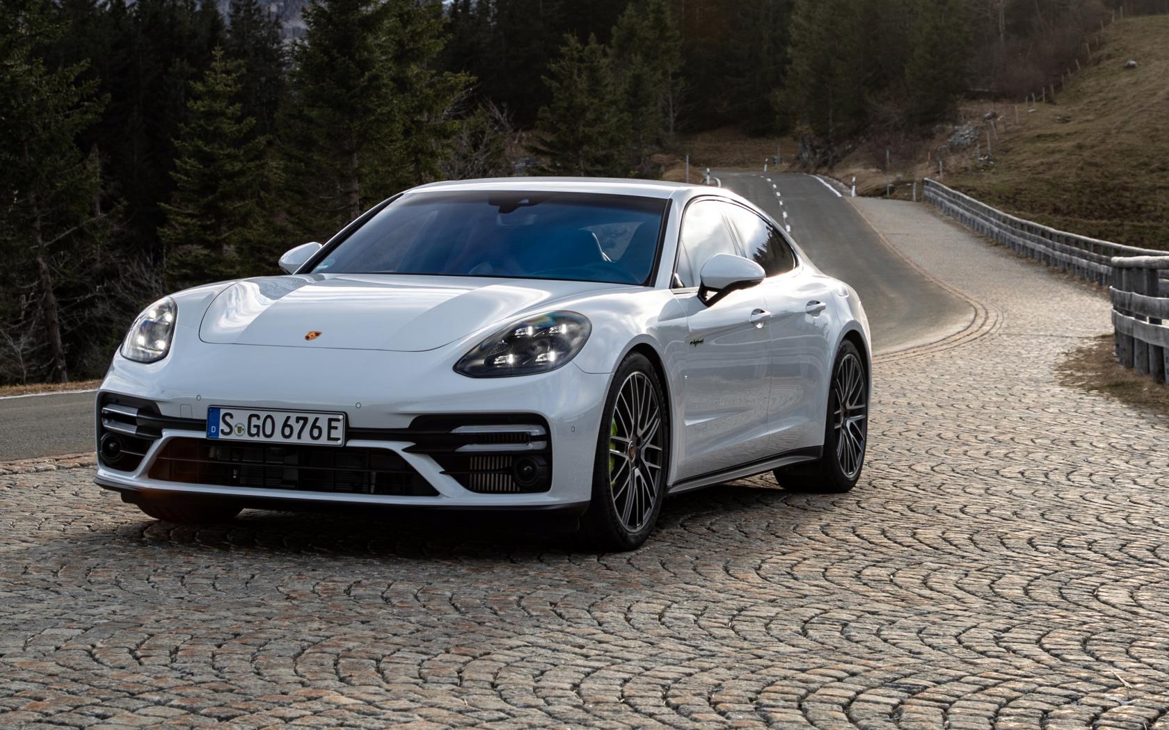 Обои Белый автомобиль Porsche Panamera Turbo S E-Hybrid 2021 года на дороге