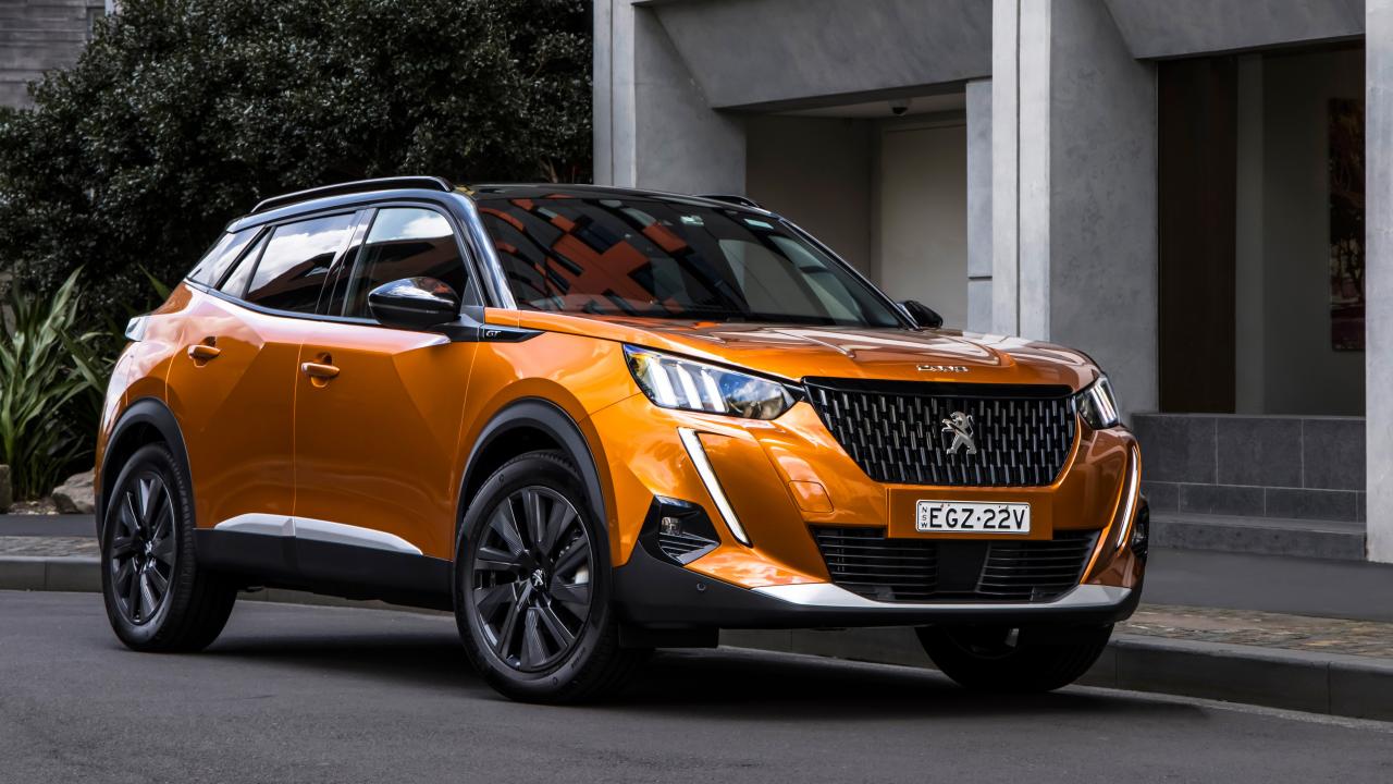 Обои Оранжевый внедорожник Peugeot 2008 GT 2020 года у дома