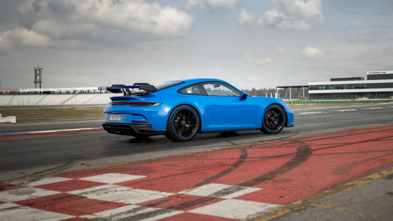 Обои Голубой автомобиль Porsche 911 GT3 2021 года на трассе