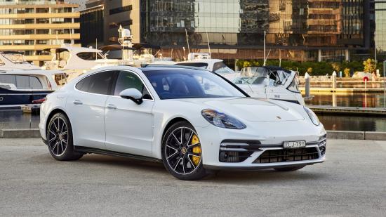 Обои Белый автомобиль Porsche Panamera Turbo S 2021 года вид спереди