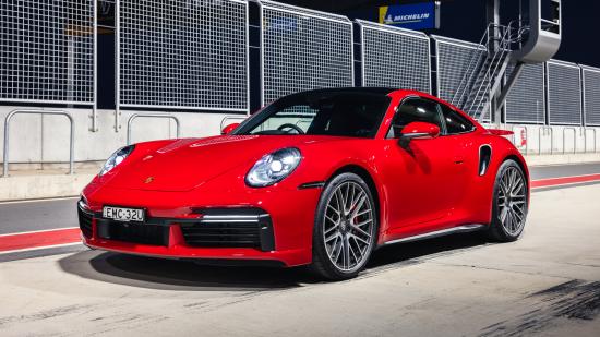Обои Красный автомобиль Porsche 911 Turbo 2021 года на стадионе
