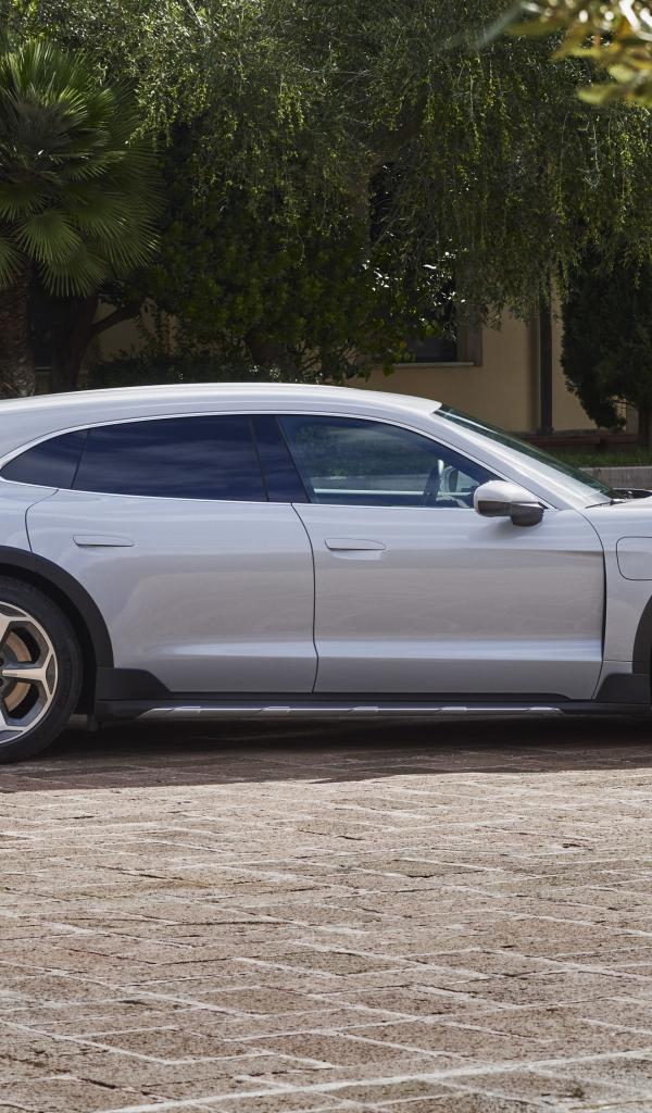 Обои Серебристый автомобиль Porsche Taycan 4S Cross Turismo 2021 года у дома