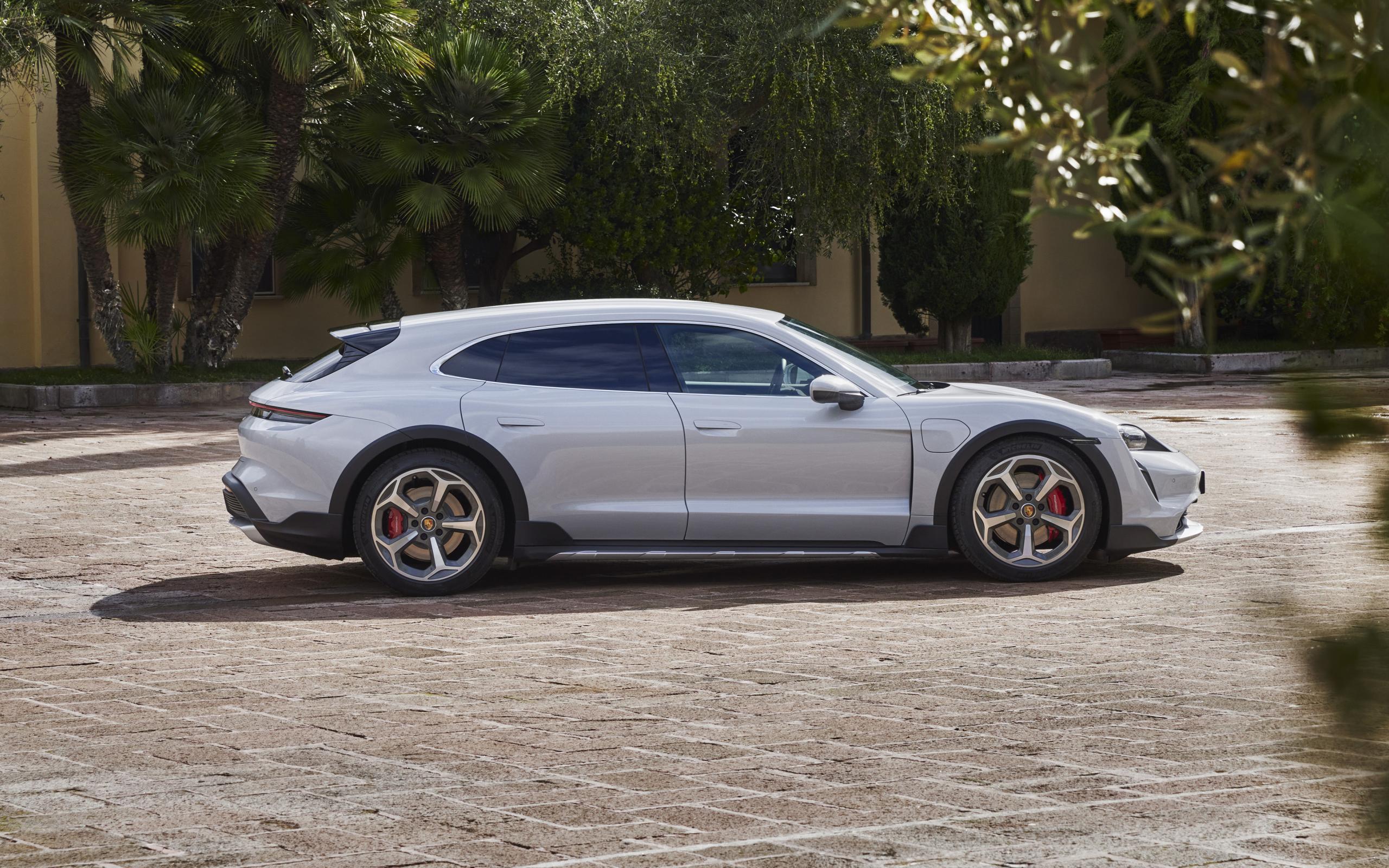 Обои Серебристый автомобиль Porsche Taycan 4S Cross Turismo 2021 года у дома