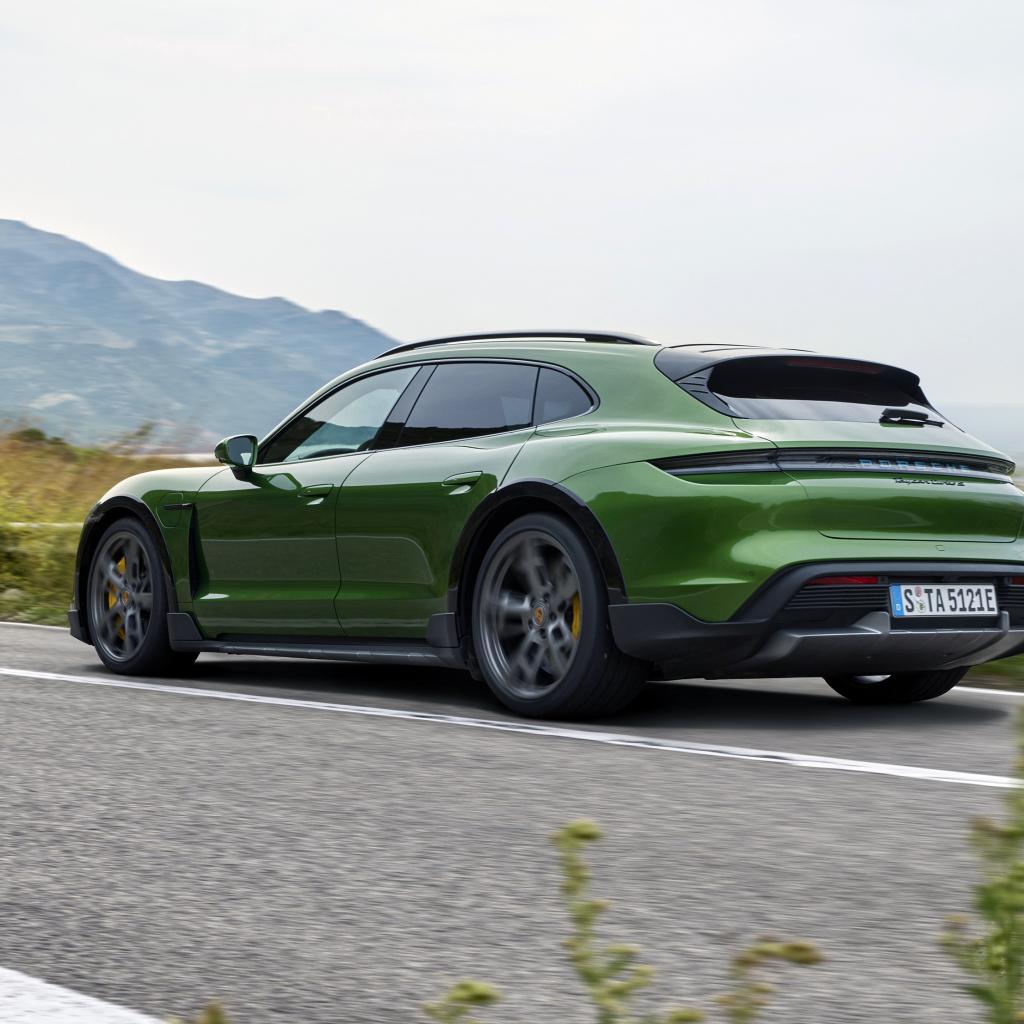 Обои Зеленый автомобиль Porsche Taycan Turbo S Cross Turismo 2021 года вид сзади