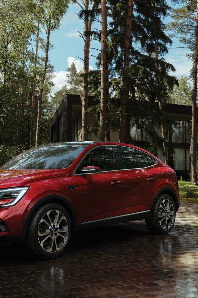 Обои Красный стильный внедорожник Renault Arkana, 2018 года в лесу