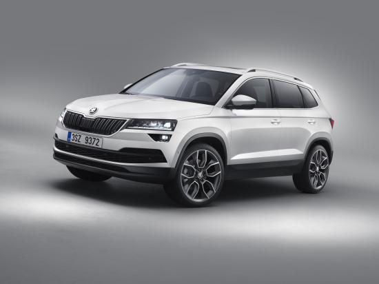 Обои Белый внедорожник Škoda Karoq на сером фоне
