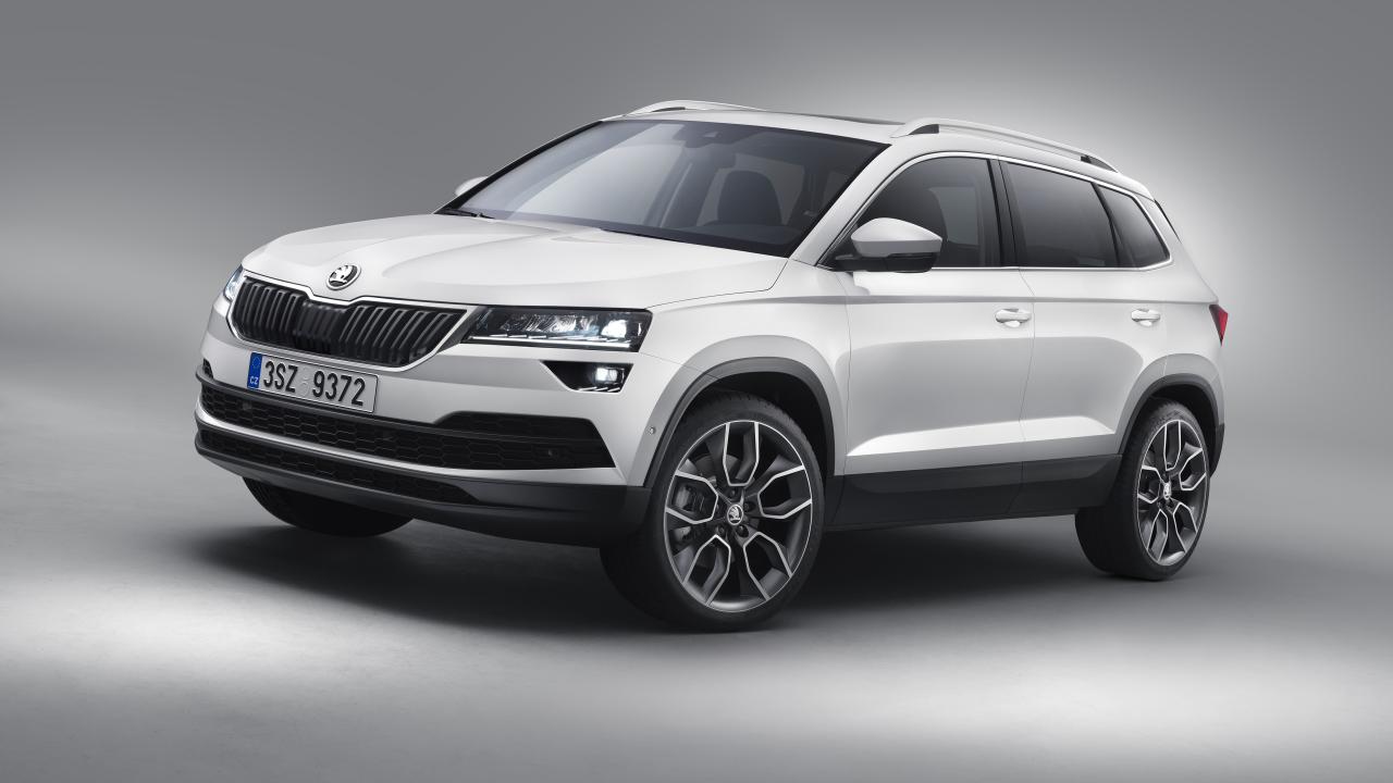 Обои Белый внедорожник Škoda Karoq на сером фоне