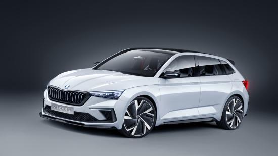 Обои Белый автомобиль Skoda Vision RS 2018 года на сером фоне