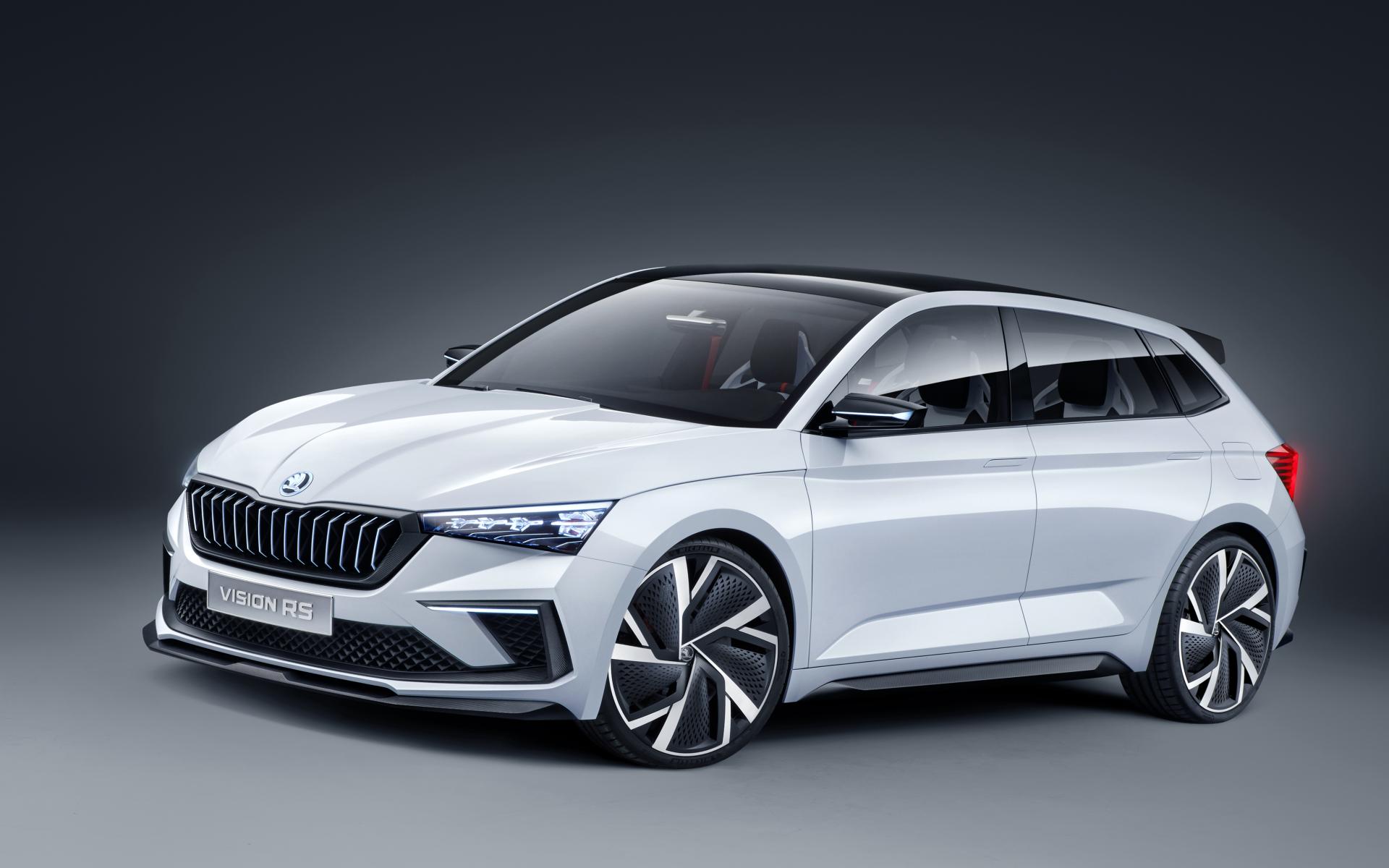 Обои Белый автомобиль Skoda Vision RS 2018 года на сером фоне