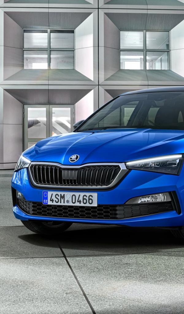 Обои Синий автомобиль Skoda Scala 2019 года в автосалоне