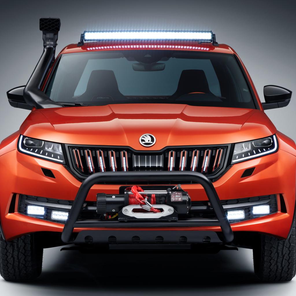 Обои Красный внедорожник Skoda Mountiaq Concept 2019 года на сером фоне