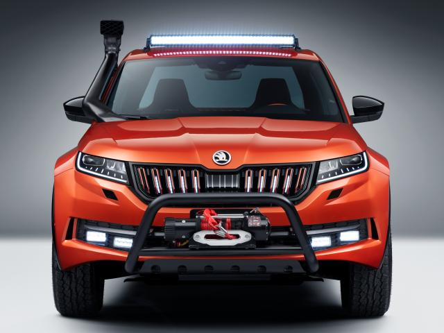 Обои Красный внедорожник Skoda Mountiaq Concept 2019 года на сером фоне