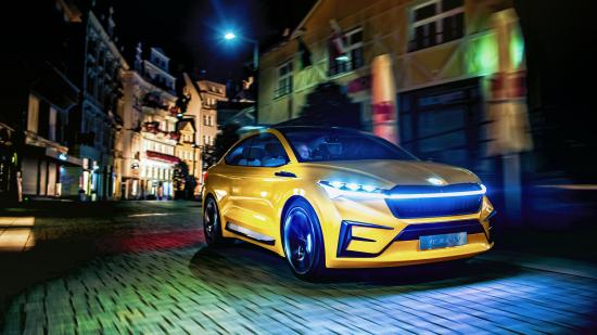 Обои Желтый автомобиль Skoda Vision IV 2019 года на улице города