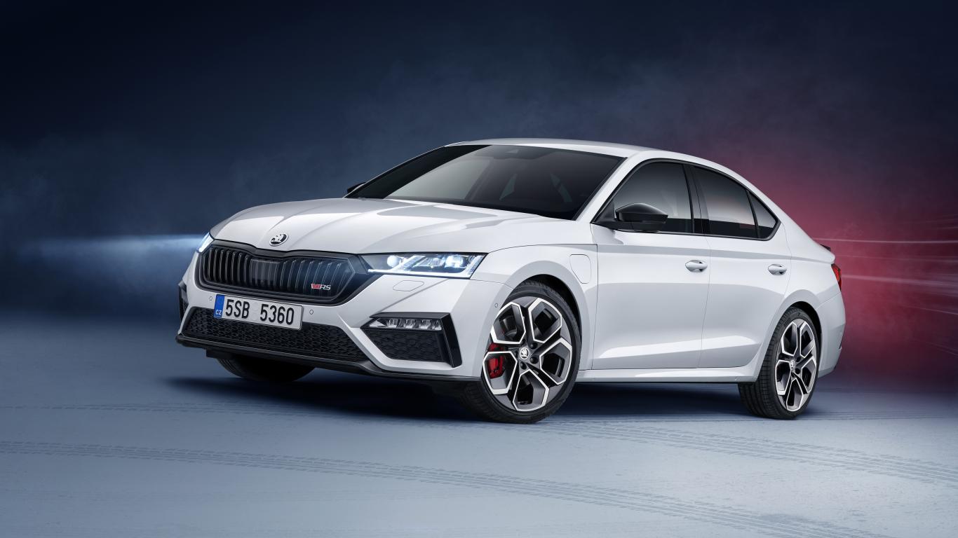 Обои Белый автомобиль Skoda Octavia RS IV 2020 года на сером фоне