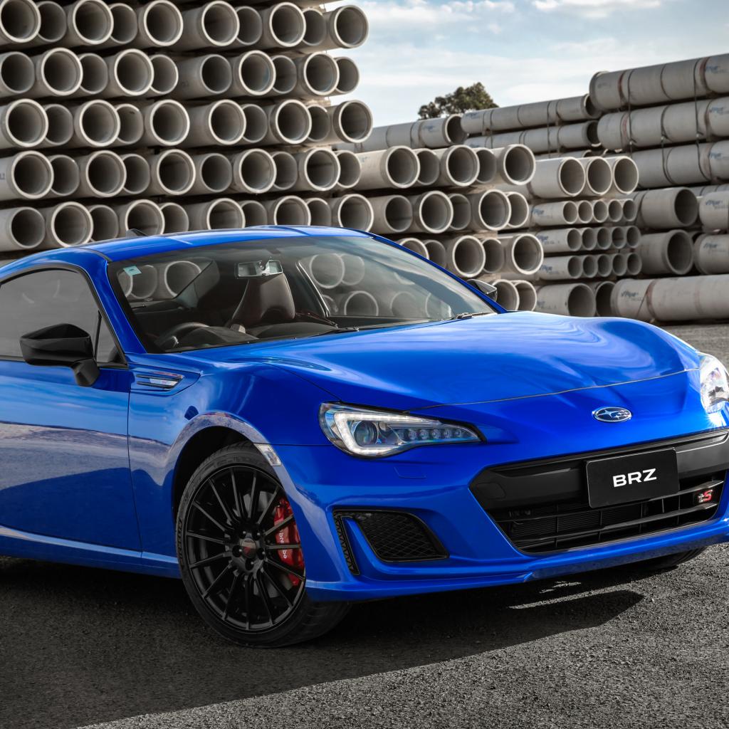 Обои Синий автомобиль Subaru BRZ tS, 2018 на фоне труб