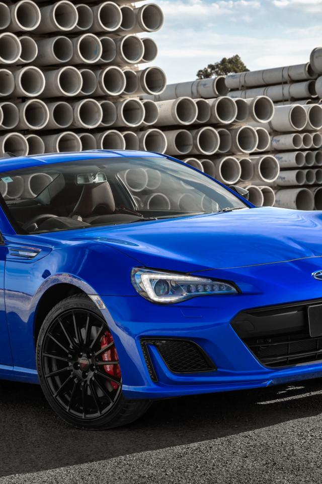 Обои Синий автомобиль Subaru BRZ tS, 2018 на фоне труб
