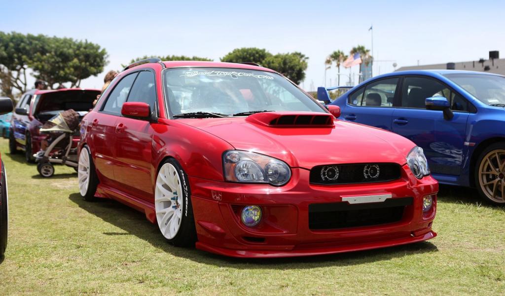 Обои Красный Subaru Impreza WRX на парковке