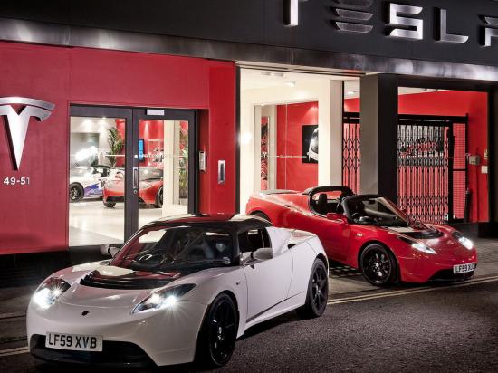 Обои Tesla Roadster возле автосалона