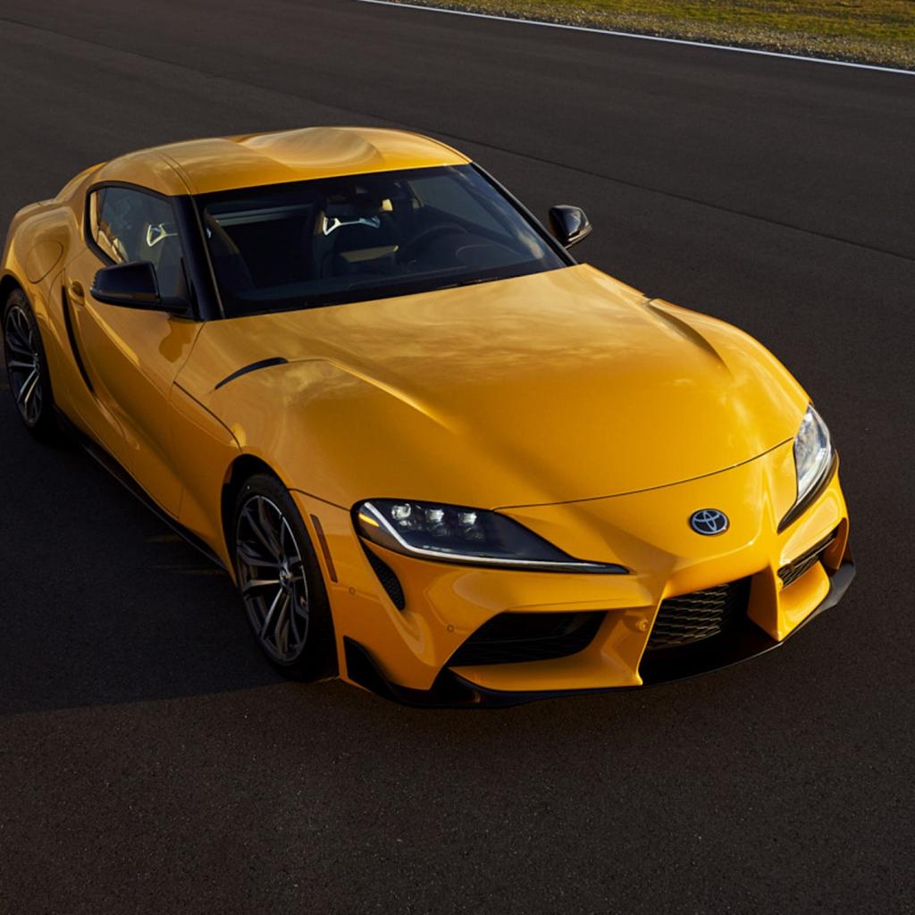 Обои Желтый автомобиль Toyota GR Supra, 2021 года на трассе