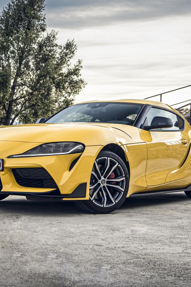 Обои Желтый автомобиль Toyota GR Supra 2, 2020 года у старого здания
