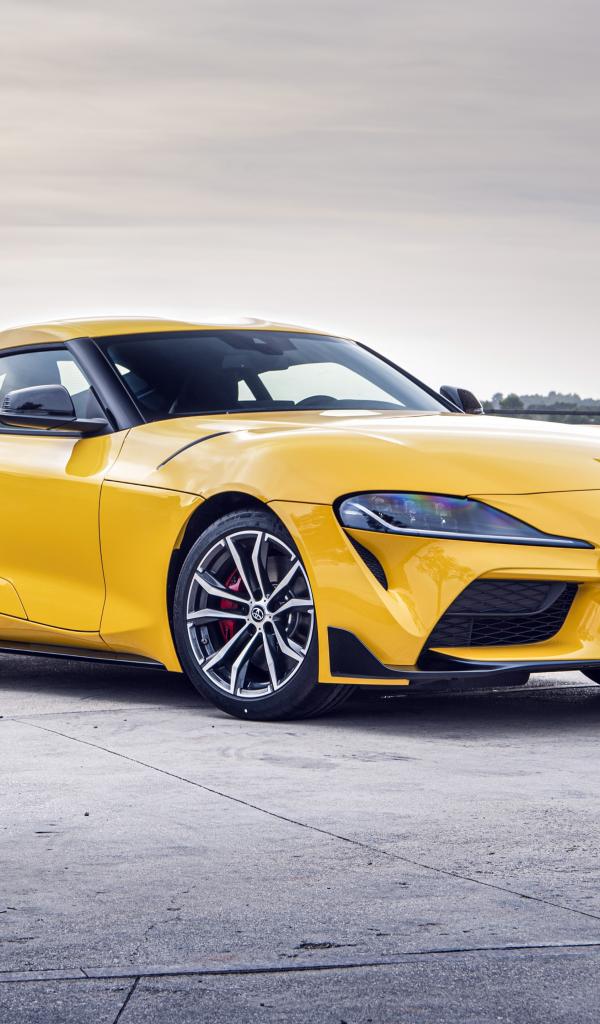 Обои Желтый автомобиль Toyota GR Supra 2 2020 года у здания