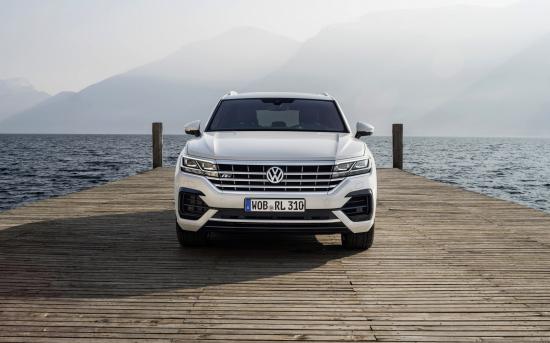 Обои Белый автомобиль Volkswagen Touareg, 2018 года на мосту