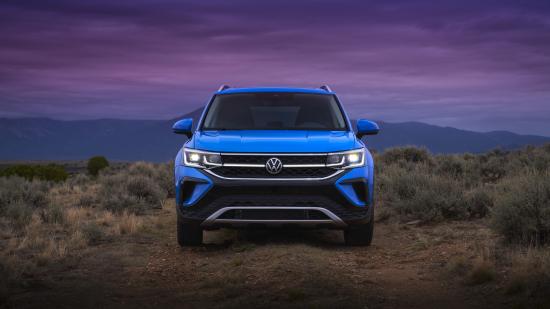 Обои Голубой автомобиль Volkswagen Taos, 2021 года вид спереди