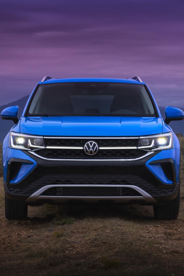 Обои Голубой автомобиль Volkswagen Taos, 2021 года вид спереди