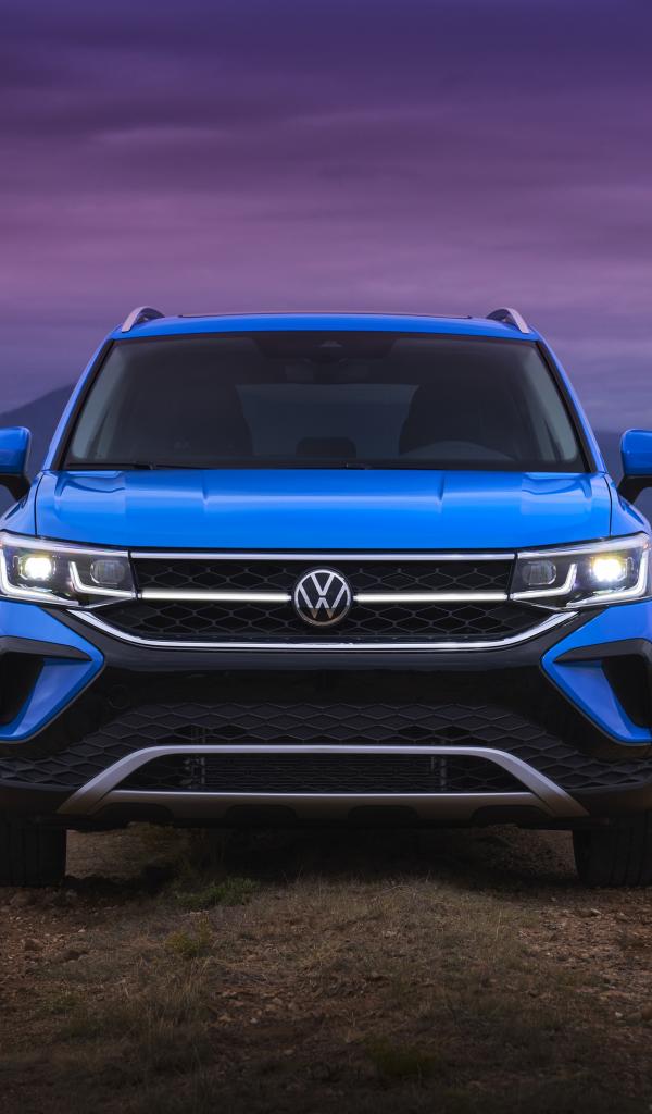 Обои Голубой автомобиль Volkswagen Taos, 2021 года вид спереди