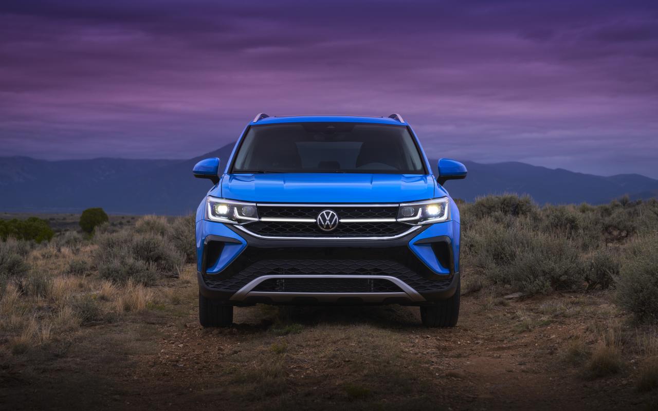 Обои Голубой автомобиль Volkswagen Taos, 2021 года вид спереди