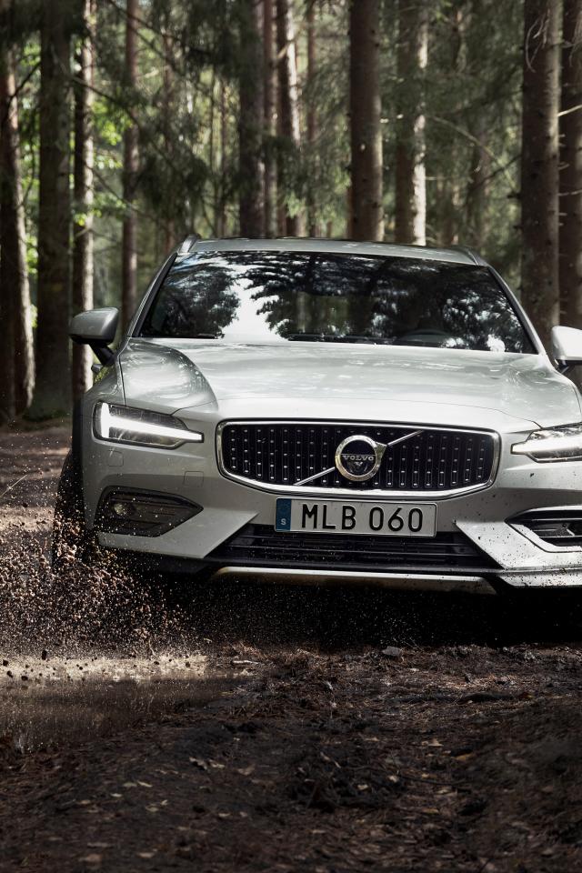 Обои Серебристый автомобиль Volvo V60 T5 едет по грязной лесной дороге