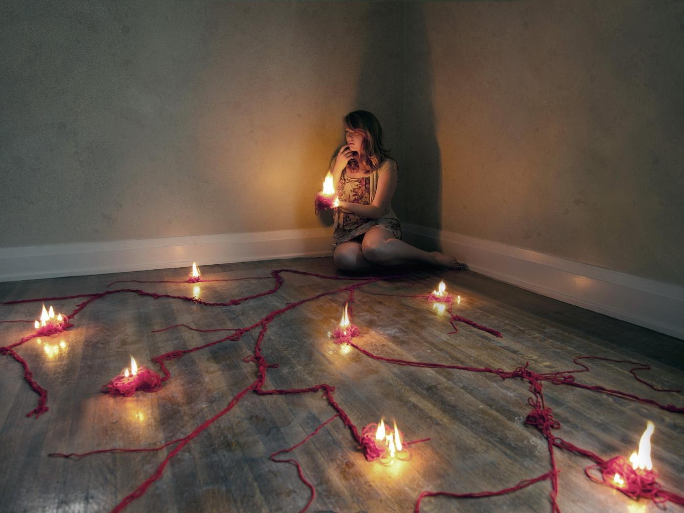 Обои Девушка в углу комнаты среди свечей