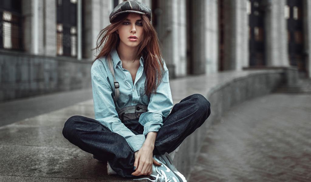 Обои Девушка в берете сидит на краю дорожки