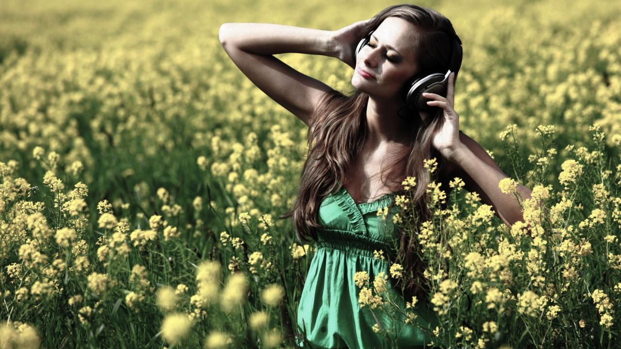 Обои Девушка стоит среди цветов в наушниках
