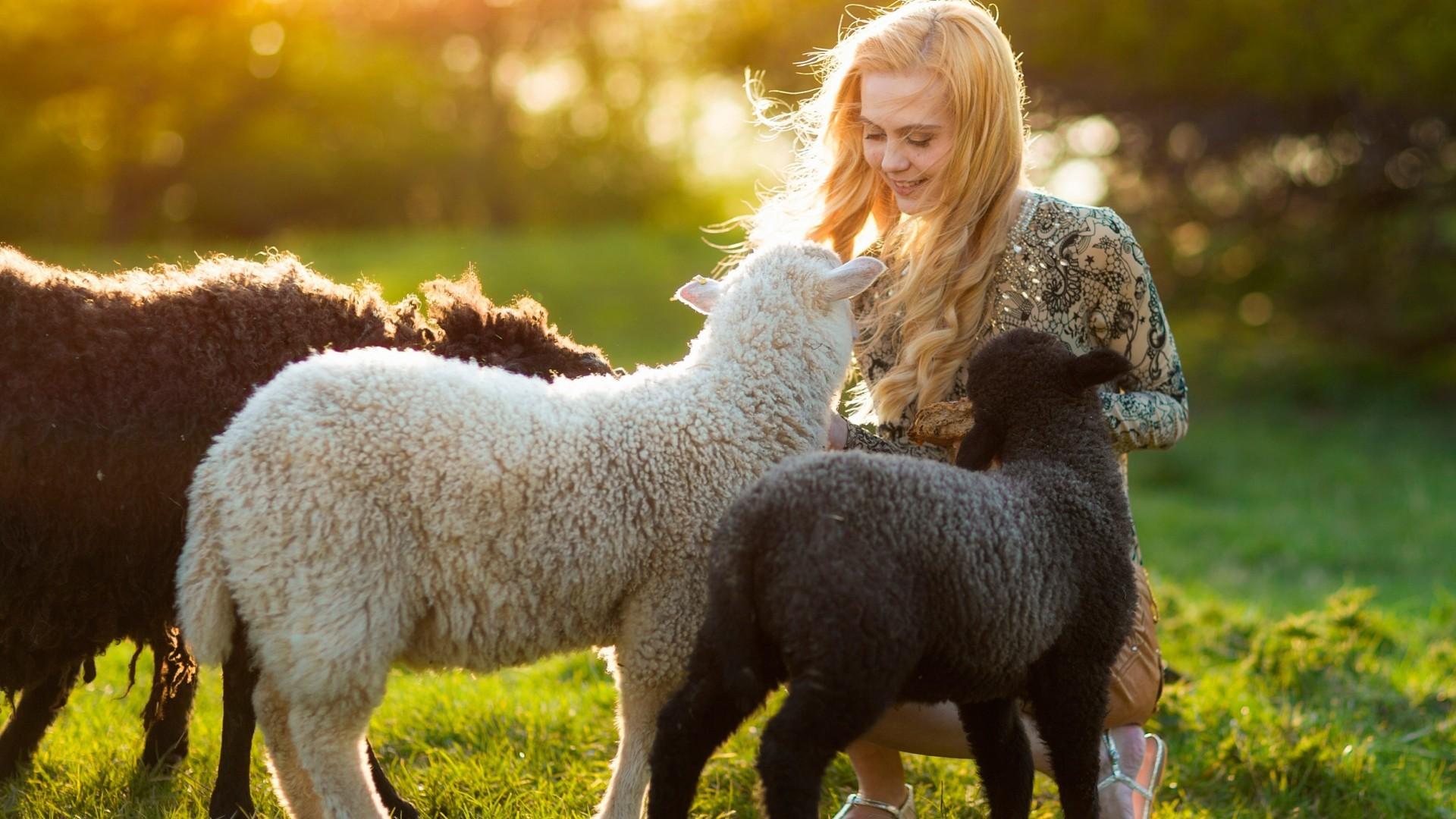 Обои Девушка с ягнятами