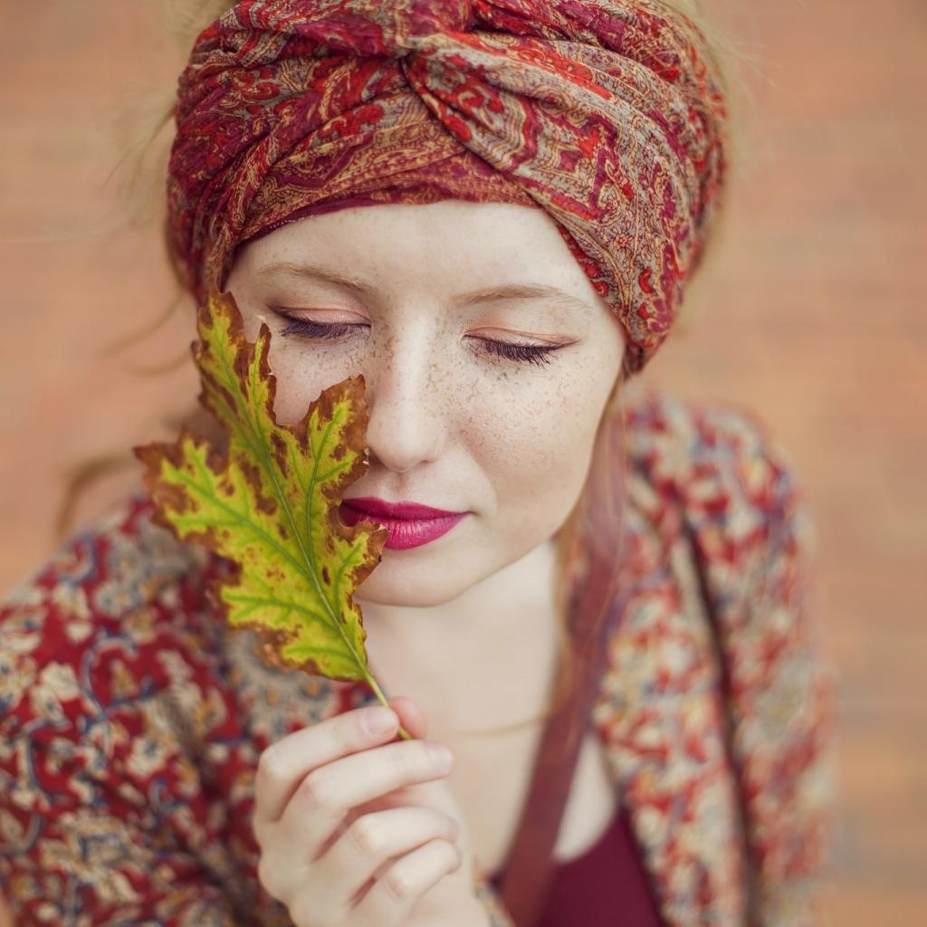Обои Девушка в традиционном наряде держит в руке лист