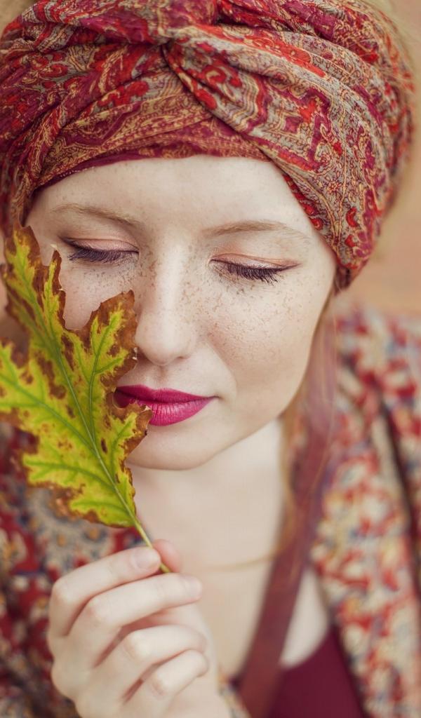 Обои Девушка в традиционном наряде держит в руке лист