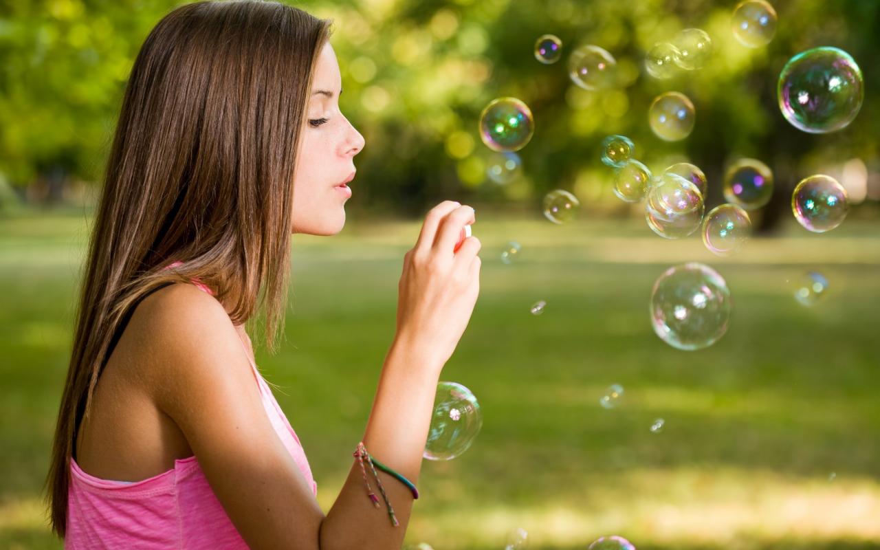 Обои Девушка в розовой футболке запускает мыльные пузыри