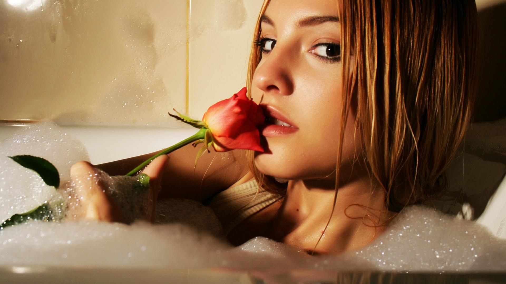 Обои Рыжая девушка с розой купается