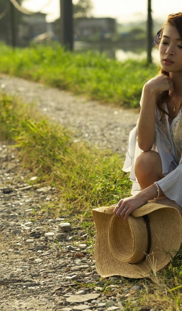 Обои Девушка со шляпой присела на дорогу