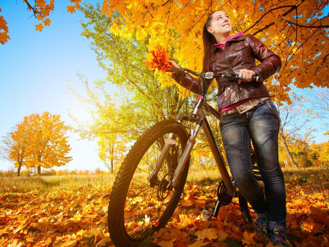 Обои Девушка с велосипедом на осенней прогулке