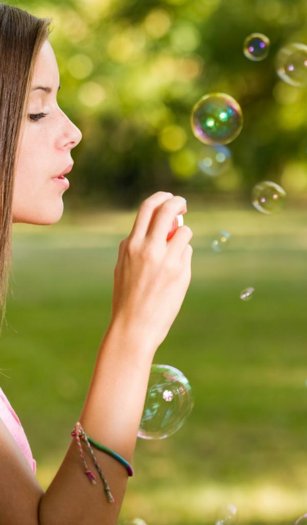 Обои Девушка играет с мыльными пузырями