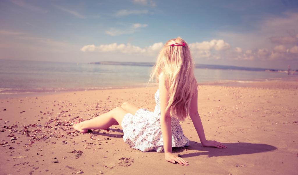 Обои Блондинка с розовой заколкой сидит на пляже